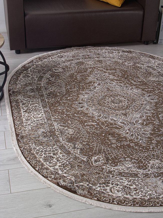 Коротко: «Ковер DOLCE D414 BROWN Овал» (DOLCE, MERINOS) — ковер для дома, гостиной. материал: полипропилен + Полиэстер, стиль: в классическом стиле, цвет: серый, коричневый, ворс: 7 мм, плотность: 560000 точек/м², основа: джут, ориентирован на классическую подачу, страна производства: Россия.
