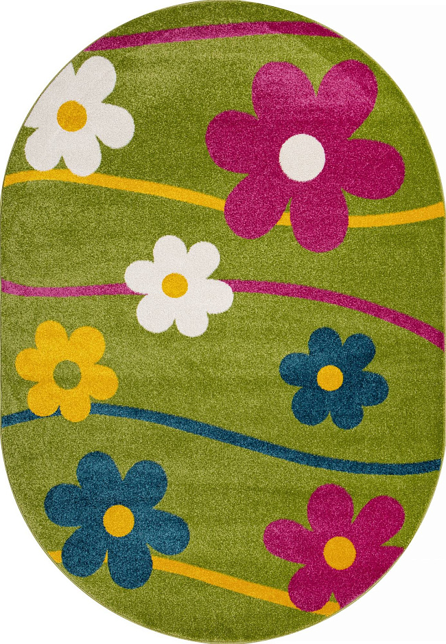 Коротко: «Ковер RIO 1021 GREEN Овал» (RIO, MERINOS) — ковер для детской, дома. материал: полипропилен, стиль: детский, цвет: зеленый, фиолетовый, оранжевый, желтый, белый, ворс: 10 мм, плотность: 304000 точек/м², основа: джут, подходит для детского интерьера, страна производства: Россия.
