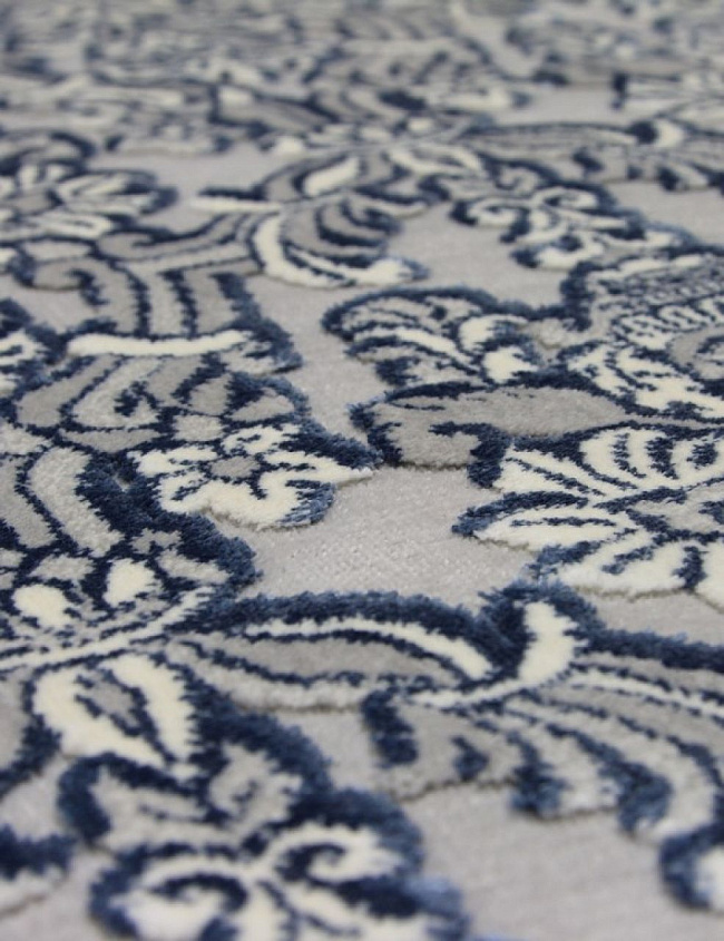 Коротко: «Ковер TIFFANY 0VC953 SILVER V» (TIFFANY, Roger Vanden Berghe) — ковер для дома, гостиной. материал: вискоза, стиль: в современном стиле, цвет: серый, синий, ворс: 6.25 мм, плотность: 1000000 точек/м², основа: джутовая, подходит для современного интерьера, страна производства: Бельгия.
